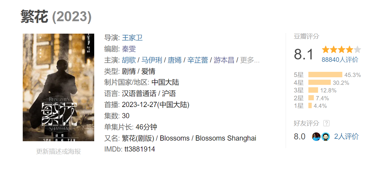 《似锦》豆瓣开出8.1分不虞外,一方面,电视剧制作如实没的说,满满的电影感,每一帧皆让东说念主念念拿出来作念壁纸,透顶传承了王家卫的作风,根究、细致、有腔调,颜色和光影的诳骗上乘,为了突显年代感的同期不显得太假,电视剧多为室内戏份,每逢展示城市风貌时,就用府上影像或小景别,这样的处理很机灵,既不违和,也不会显得制作轻便。